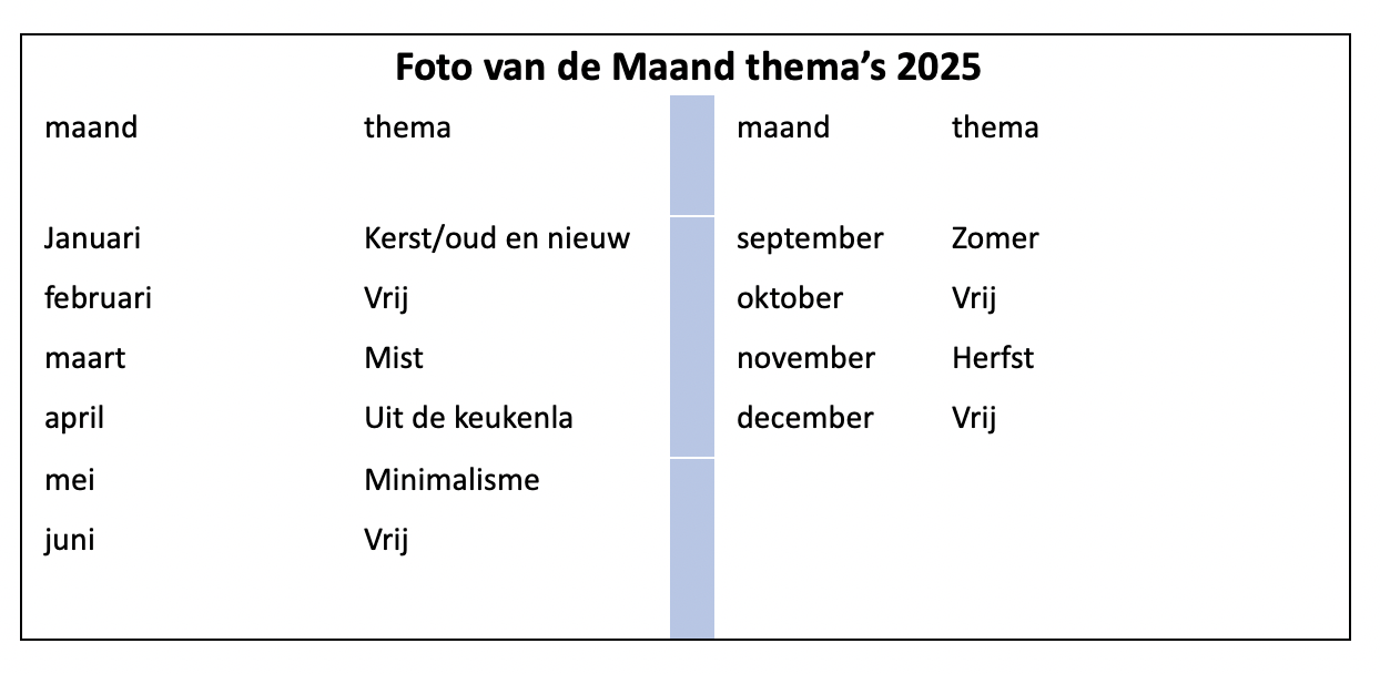 Bespreken Foto vd Maand november plus foto’s van 25 Nov. Leden worden uitgenodigd eigen werk mee te brengen. Plus eventueel foto bewerken