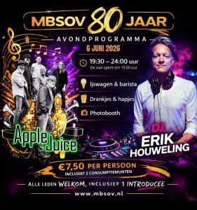 Ter ere van het 80 jarig bestaan, organiseert de MBSOV een feestavond met thema Glitter & Glamour. Het beloofd een prachtige avond te worden m.m.v een geweldige band, een DJ, er zijn diverse hapjes er is een koffiekar, ijskar enz.